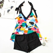 送料無料 2024 プリント水着女性、保守的なウエストタンキニ 2 点セット、V ネックサスペンダーレースアップ背中の開いた水着 Vネック AE33232335547967433527