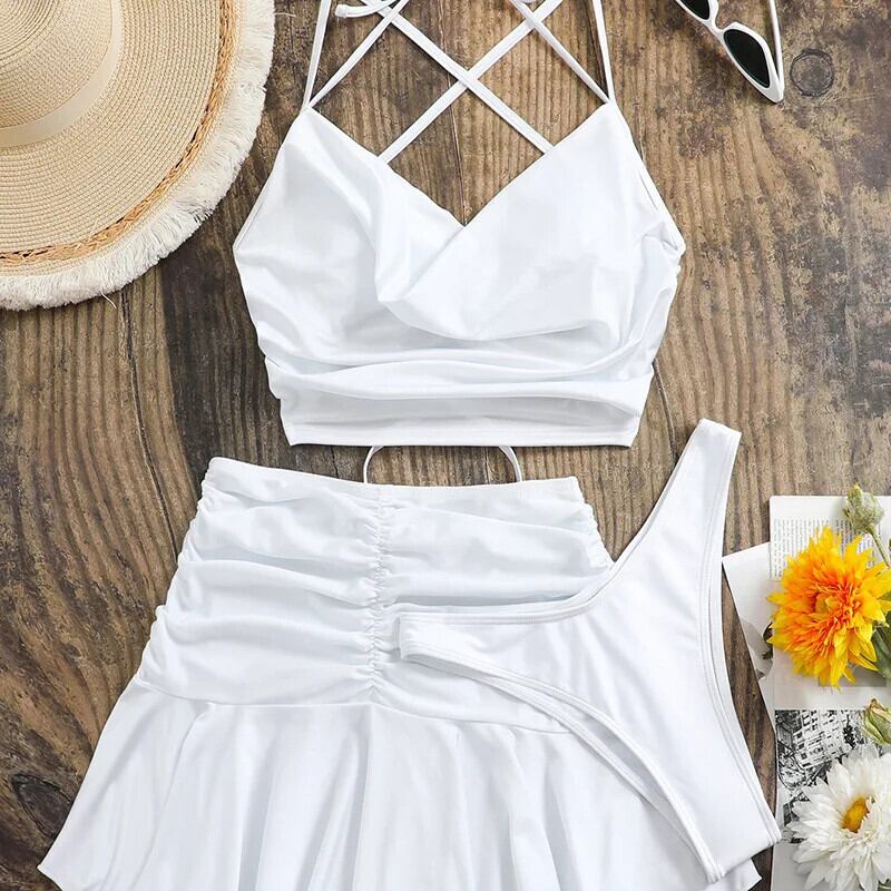 送料無料 ソリッドホワイト 3 ピース水着 2023 女性のセクシーなプリーツウエストビーチスカートビキニ V ネック包帯背中の開いた水着水着 Vネック ソリッドカラー AE33232335540919613790