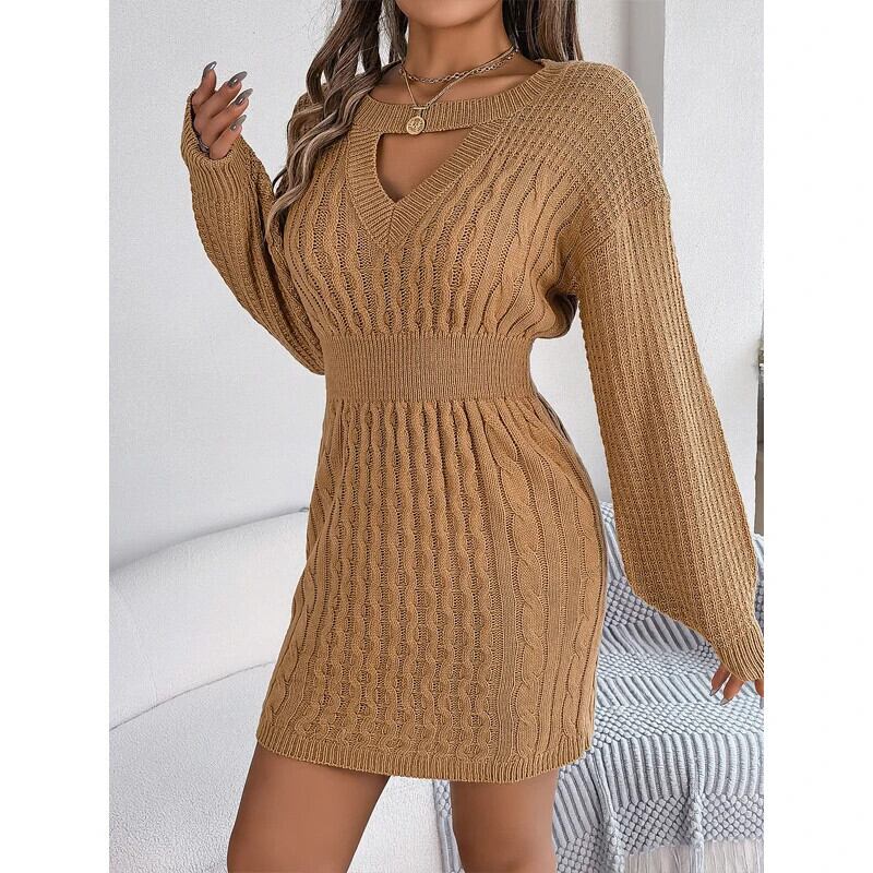 送料無料 ソリッドカラーセータードレス女性、2023秋冬、暖かい、長袖プルオーバー、ファッション中空アウト、100%アクリル繊維 ロング オータム 秋物 ウィンター 冬物 AE33232335535696568548