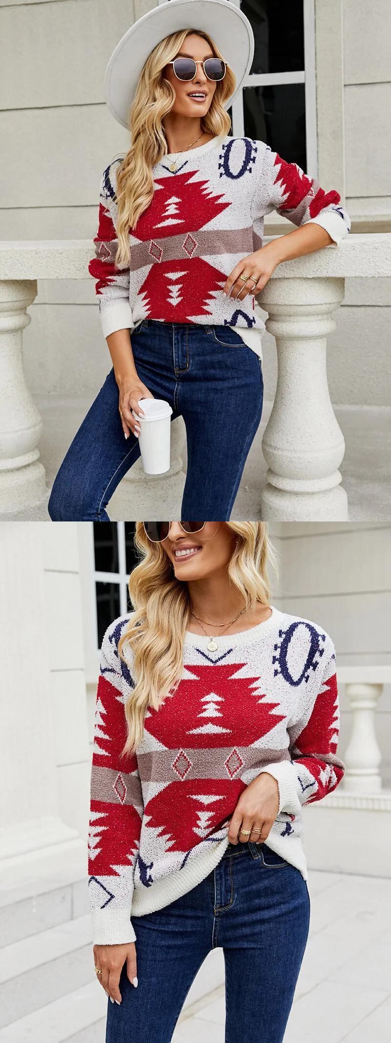 送料無料 長袖ニットセーターの女性 2023 秋/冬ラウンドネック幾何プリントプルオーバーコントラストセーターポリエステル ロング オータム 秋物 ウィンター 冬物 Oネック AE33232335569897896166