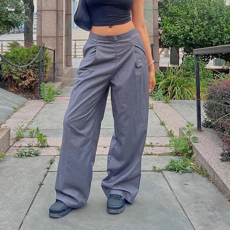 送料無料 ボタンアップローウエストストレートパンツ女性 2023 秋無地ベーシックドレープルーズワイドレッグパンツグレー オータム 秋物 ワイドパンツ ソリッドカラー AE33232335527255893302