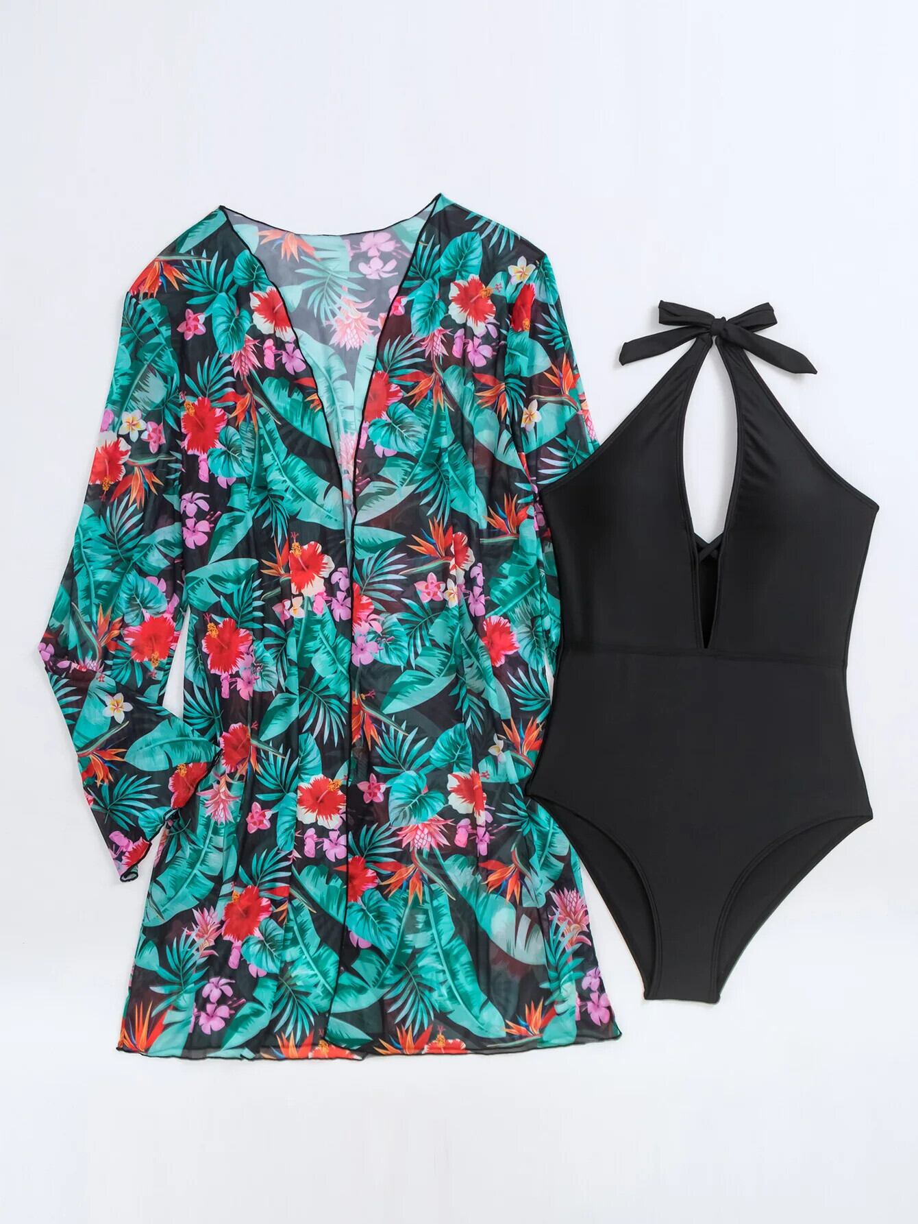 送料無料 2024 プリント長袖カバーアップビキニセット、黒のセクシーな V ネックワンピース水着女性、ハイウエスト背中の開いた水着 ハイウェスト ロング ブラック Vネック AE33232335514462721027