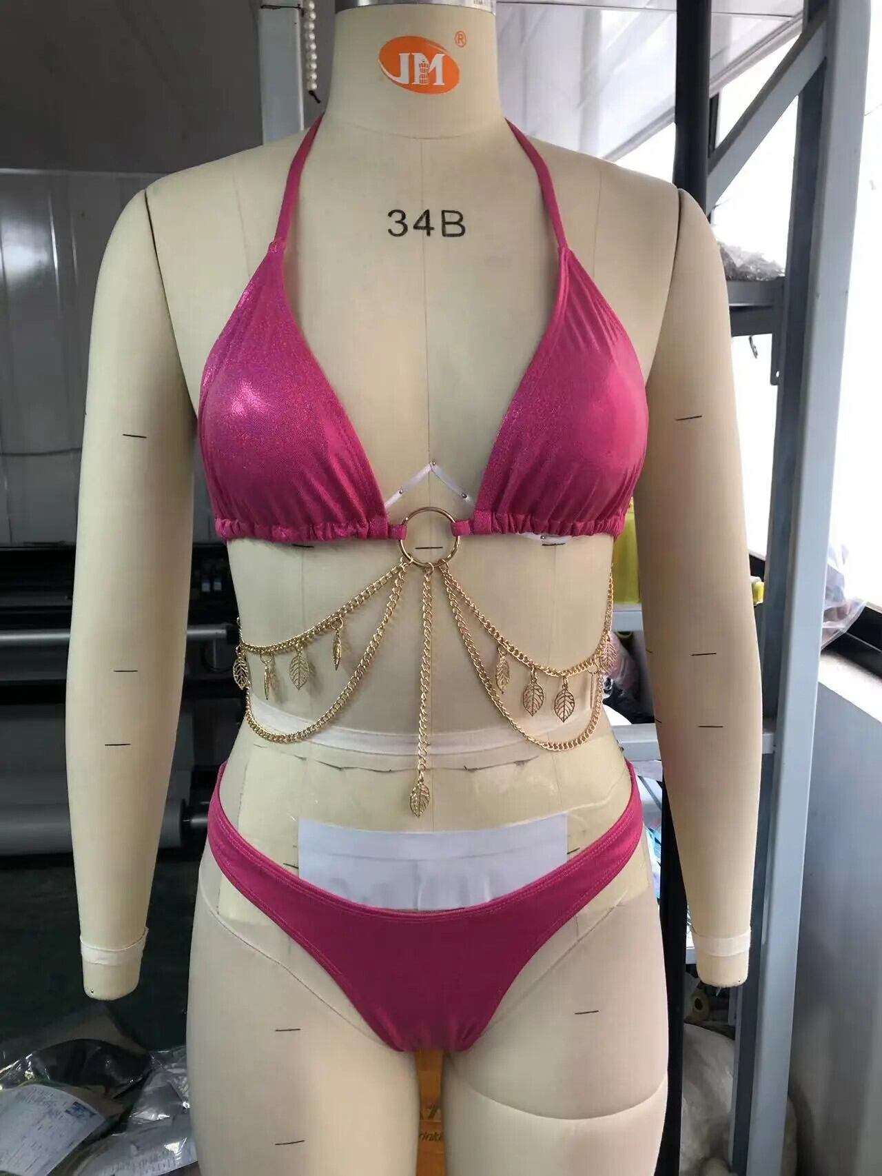 送料無料 セクシーな光沢のあるウエストチェーン水着女性、2024 夏、ローズレッド 2 ピースビキニ、三角カップ V ネックサスペンダー背中の開いた水着 サマー 夏物 Vネック AE33232335583384977121