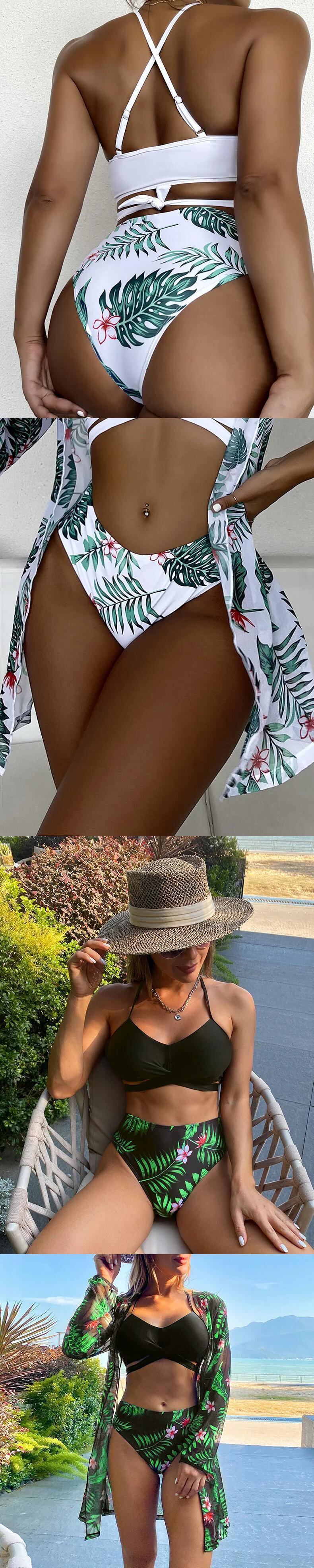 送料無料 2024 長袖プリントチュールカバーアップ水着スリーピースビキニセット女性クロス包帯セクシーなサスペンダー水着水着 ロング AE33232335590708165480