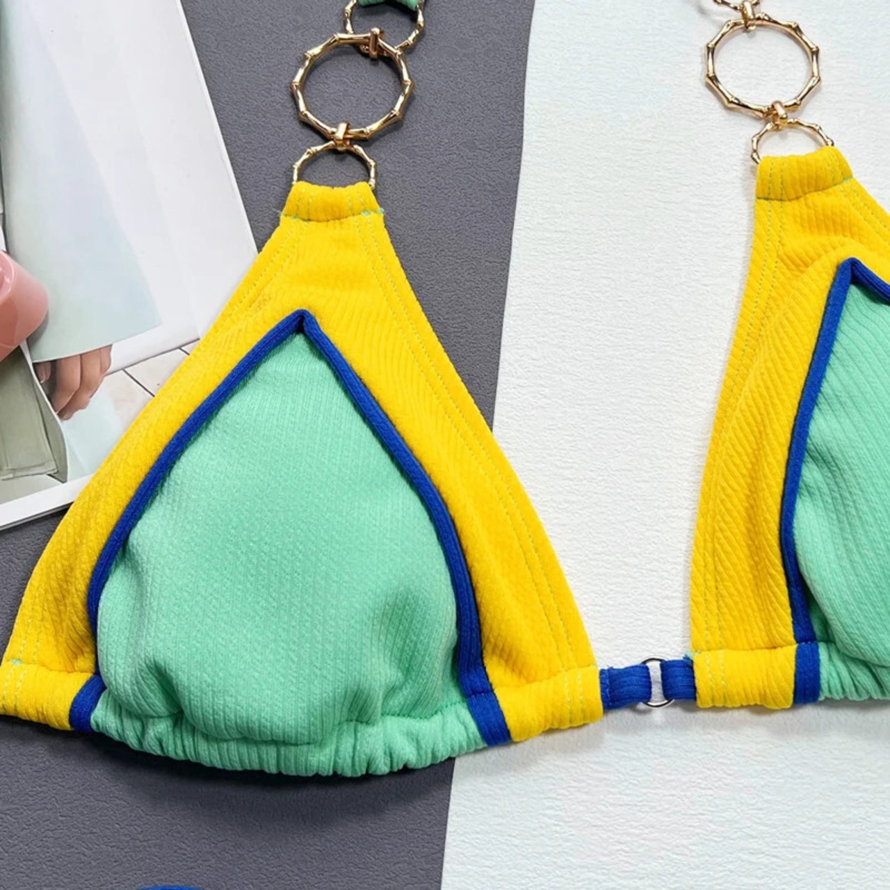 送料無料 水着女性 2024 黄緑パッチワークツーピースビキニメタルリングチェーン三角カップ V ネック水着夏の水着 サマー 夏物 Vネック 指輪 グリーン AE33232335591905889530