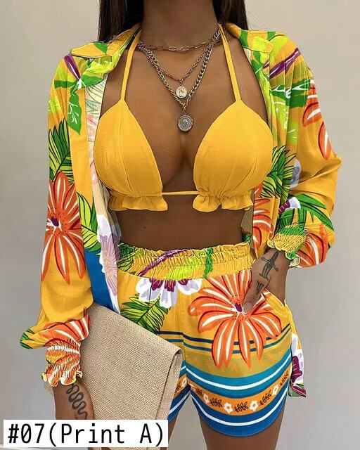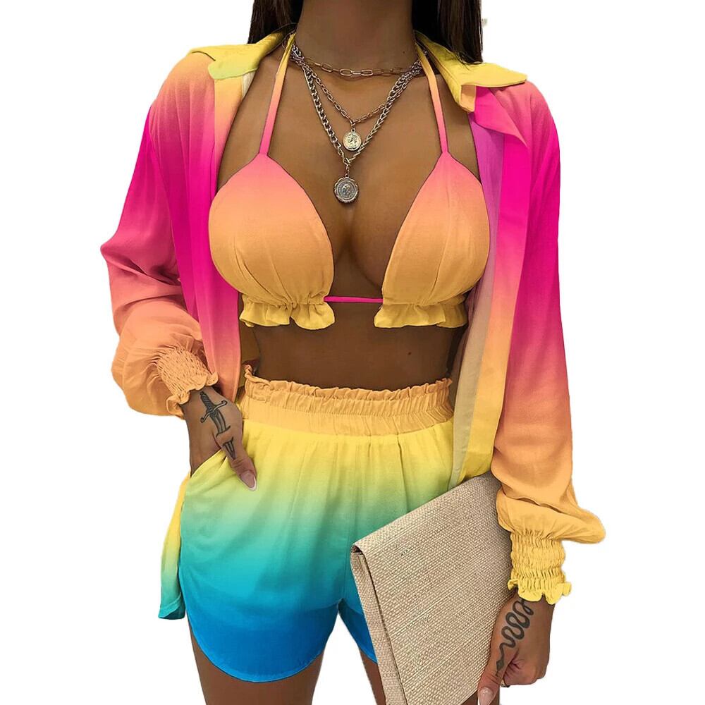 送料無料 夏 3 点セット衣装女性ビーチスタイルレインボーグラデーションプリントサスペンダーシャツショーツスーツ 3 点セット 2023 サマー 夏物 ブルマー AE33232335541086720946