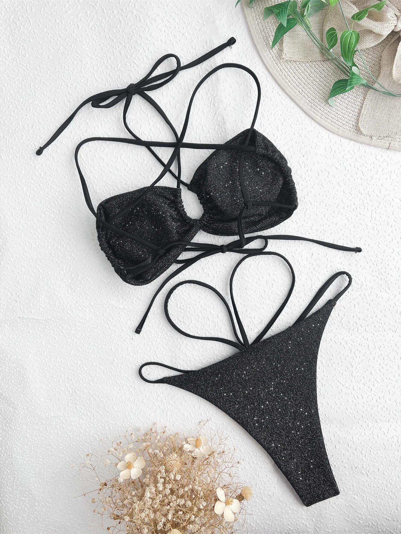 送料無料 2024 黒の光沢のある女性の水着セクシーなサスペンダー 2 ピースビーチビキニ中空アウトウエスト Tバック水着背中の開いた水着 ブラック AE33232335589245042185