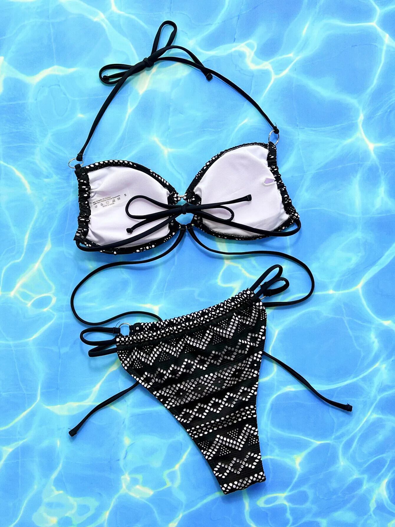 送料無料 2 ピース水着女性 2024 黒、白のチェックプリントビキニセクシーなローウエスト Tバック水着 V ネックサスペンダー夏のビーチウェア ホワイト ブラック サマー 夏物 Vネック AE33232335594958888504