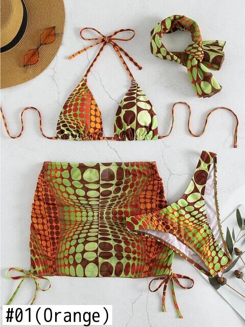 送料無料 ドットプリント水着レディース、4ピースビキニ、2023夏、ウエストビーチスカート、三角サスペンダーバックレス水着、ホルター サマー 夏物 AE33232335581606019342