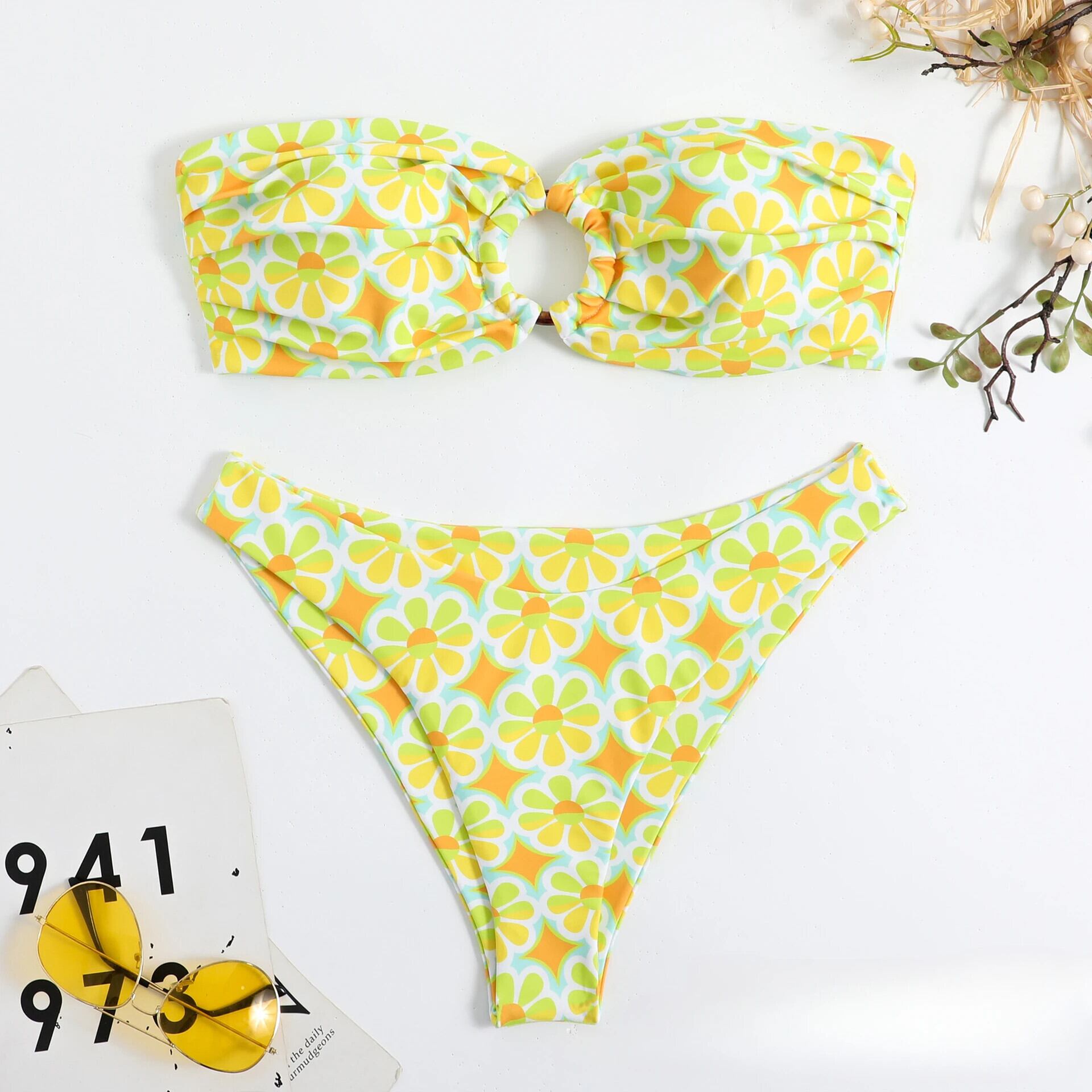 送料無料 2024 ストラップレスビキニ女性両面印刷水着セクシーな中空アウトリングツーピース水着 Tバックビーチ水着 指輪 AE33232335553518053892