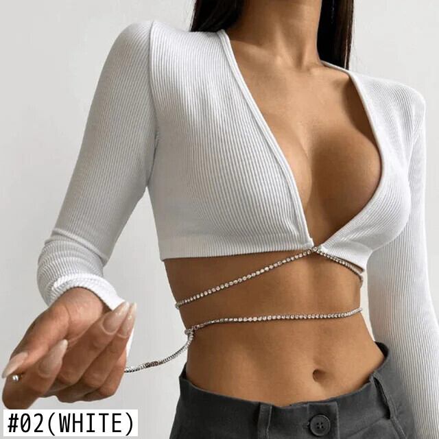 送料無料 ラインストーンチェーン女性ショートトップ 2023 秋のセクシーなディープ V 長袖ソリッドカラー Tシャツストリートボトムトップ ロング オータム 秋物 AE33232335593607314740