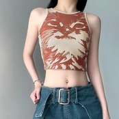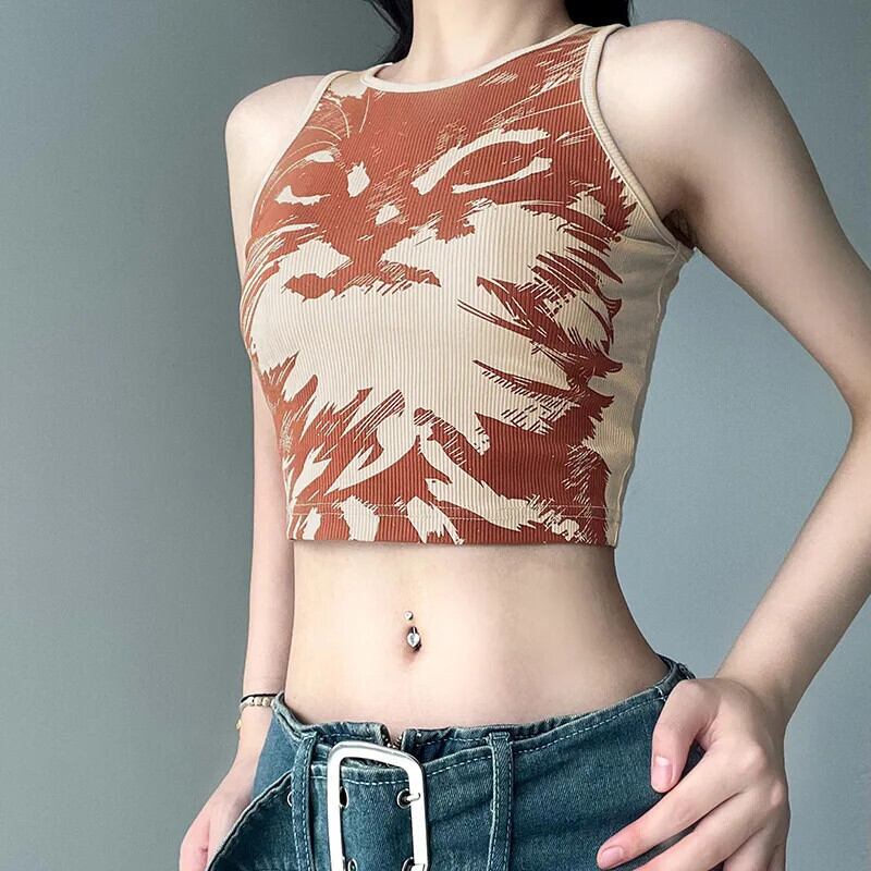 送料無料 レトロ猫プリントボトムベスト女性 2023 ラウンドネックノースリーブショートトップスタイトフィットスパイシーガールタンクを着ています AE33232335535214752012