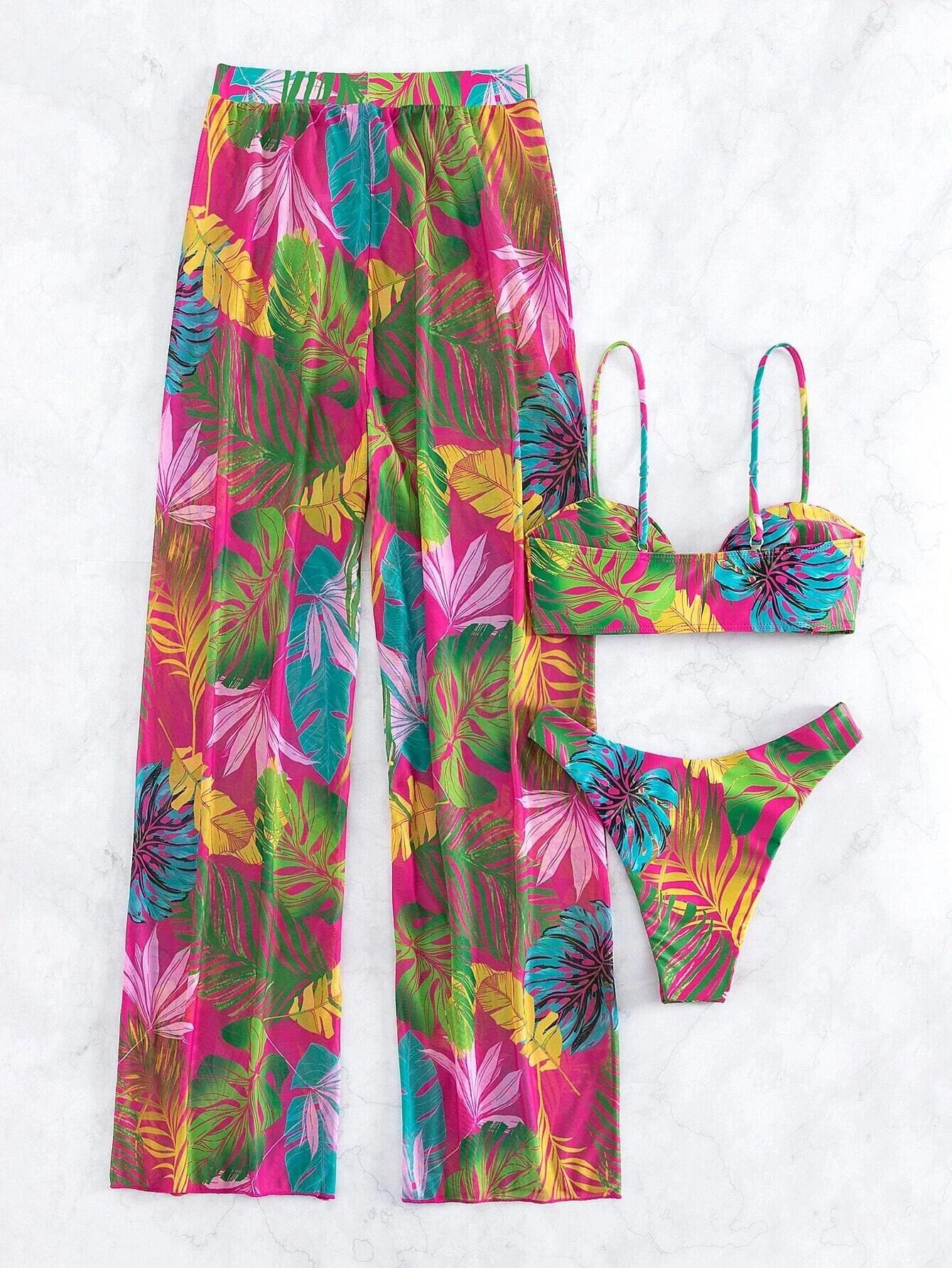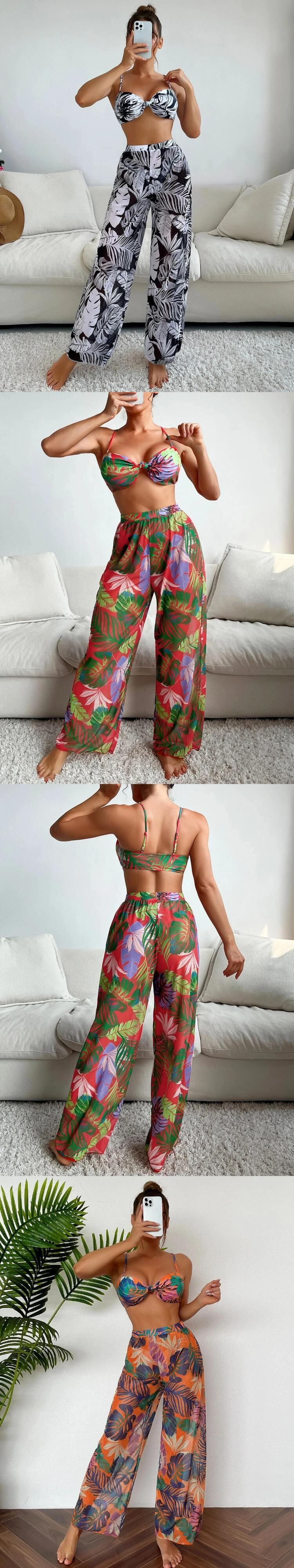 送料無料 リーフプリント 3 ピースビキニセット女性 2023 ウエストパンツ水着サスペンダー背中の開いた水着夏水着 JND20009 サマー 夏物 AE33232335569444141231