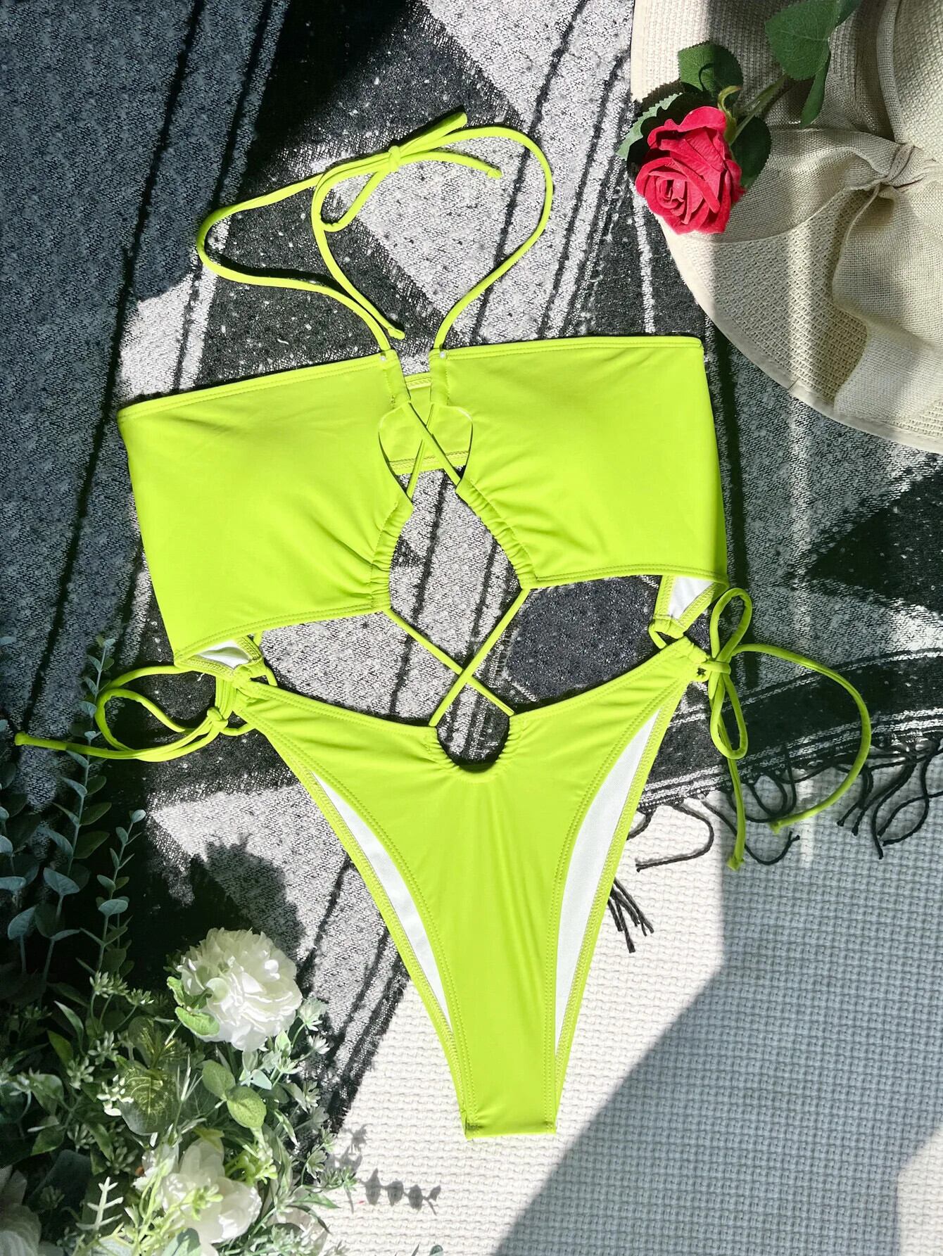 送料無料 2024 夏蛍光イエローワンピースビキニウエスト中空アウト水着女性のセクシーなクロス包帯ビーチモノキニ サマー 夏物 AE33232335589744615158