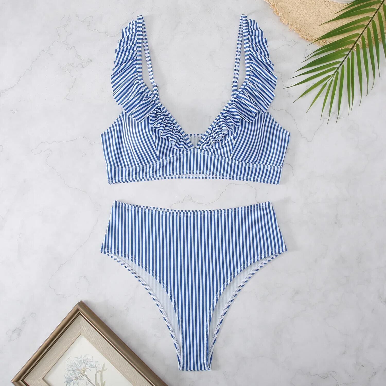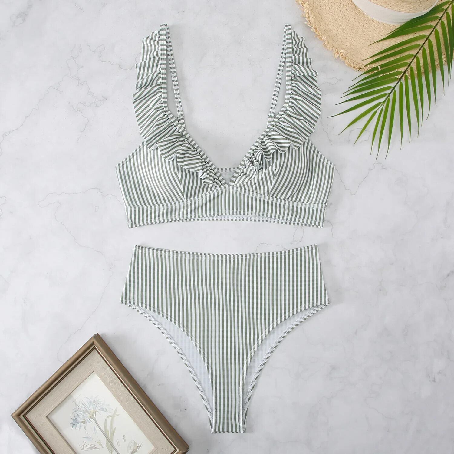 送料無料 2024 ソリッドカラービキニ女性ビーチ 2 ピース水着フリル V ネックサスペンダー水着夏休みウエスト水着 サマー 夏物 Vネック AE33232335570410116515