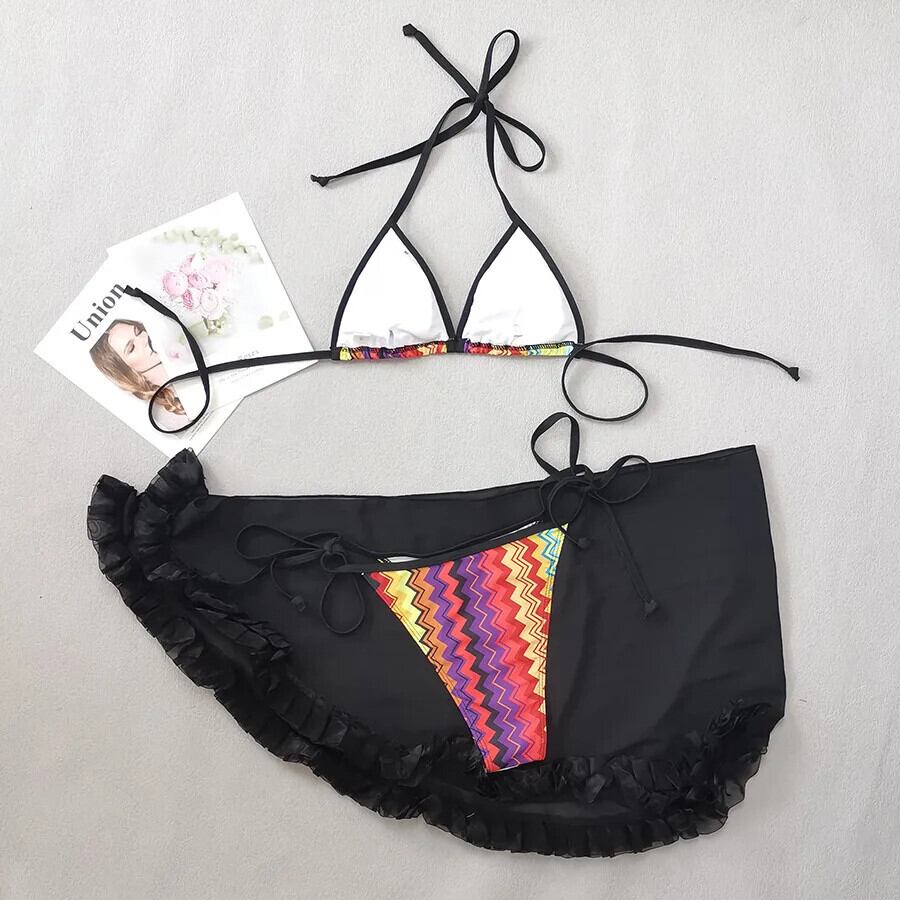 送料無料 2024 夏ビーチスカートビキニセット女性の 3 ピース水着カラフルなプリント 3 点水着 Tバックレースアップ背中の開いた水着 サマー 夏物 AE33232335514251500402
