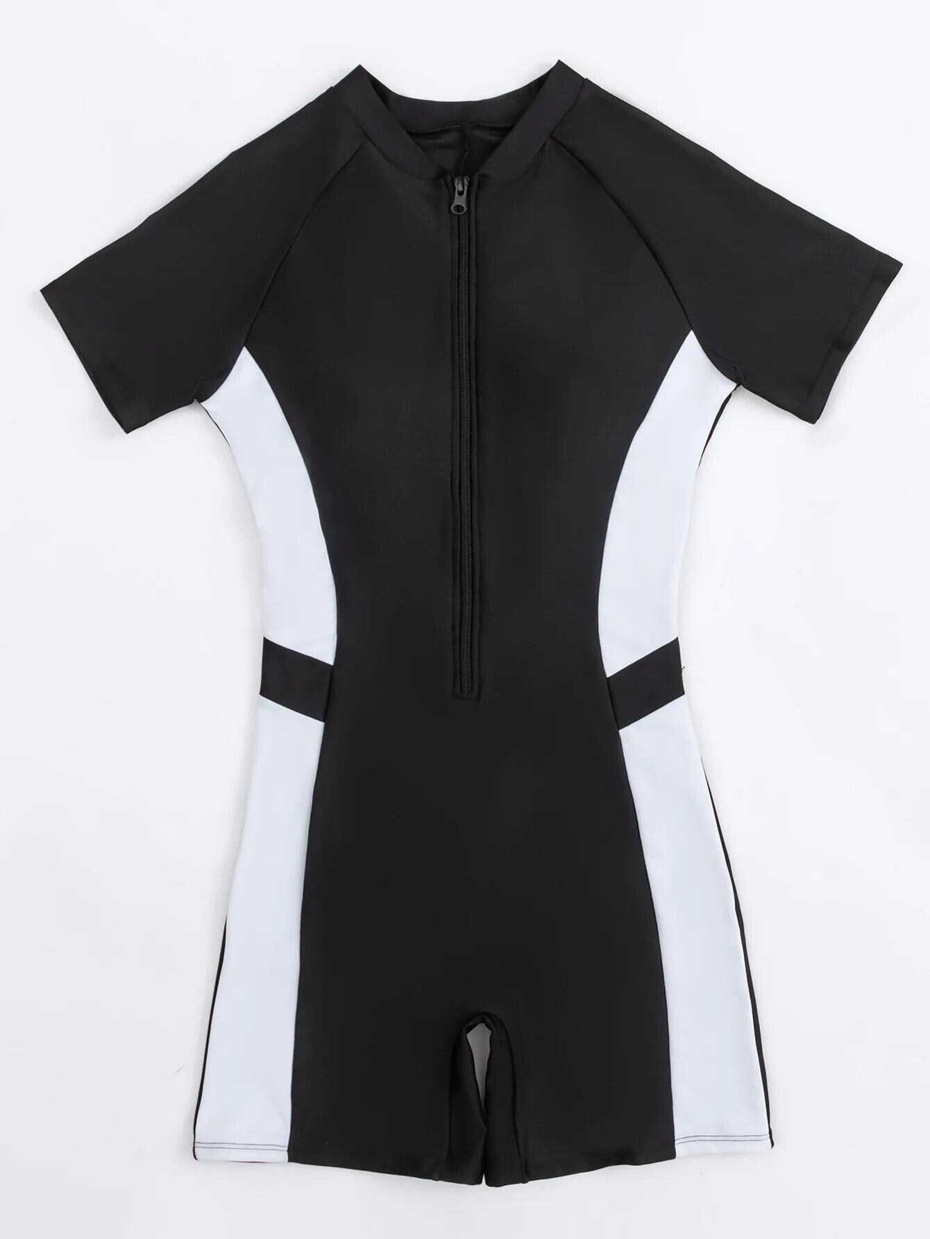 送料無料 2024 ワンピース水着女性、半袖サーフィンスーツ、伸縮性のある保守的なカラーコントラストジッパースタイルビキニ ハーフスリーブ エラスティック AE33232335588839799541