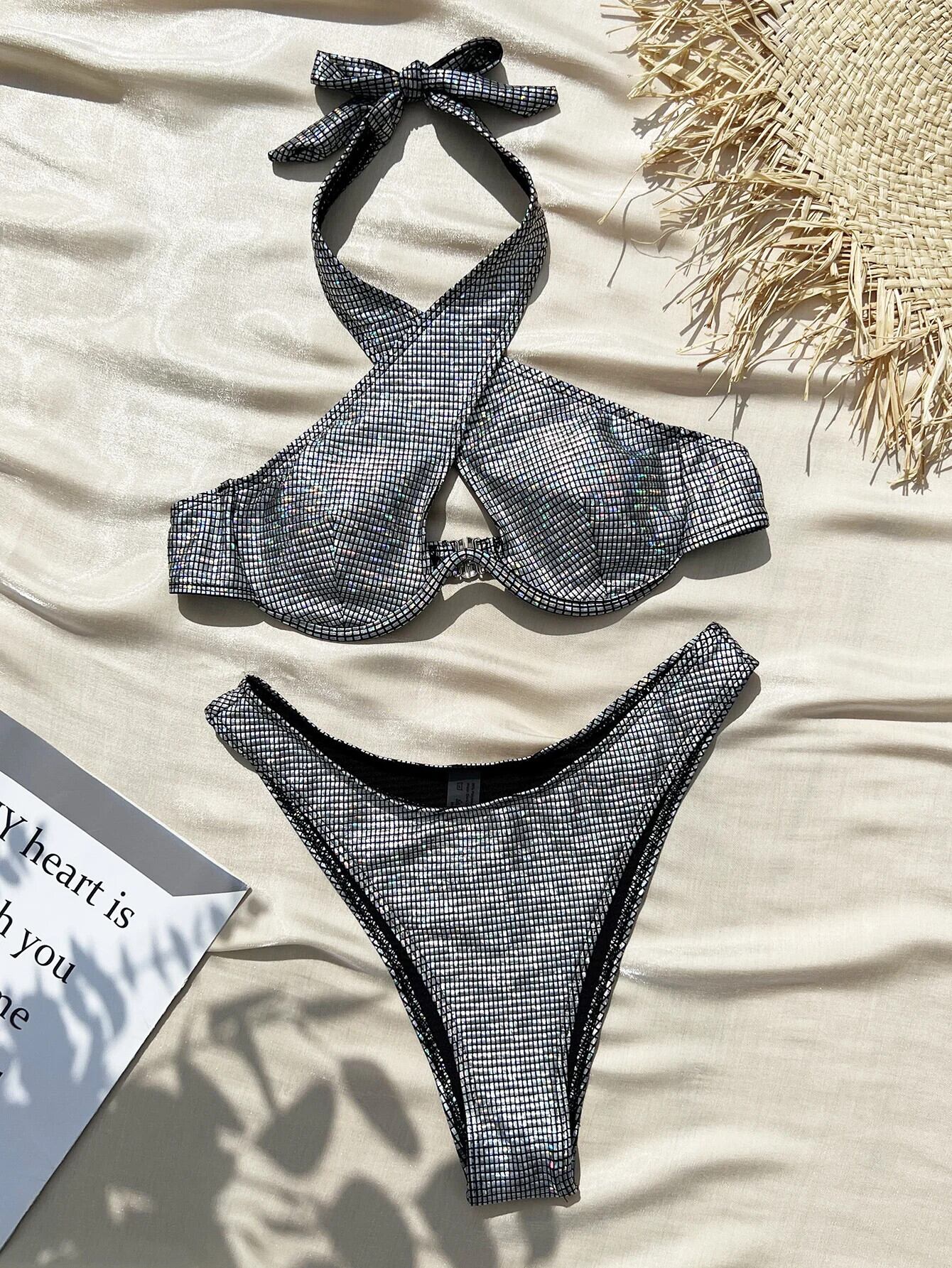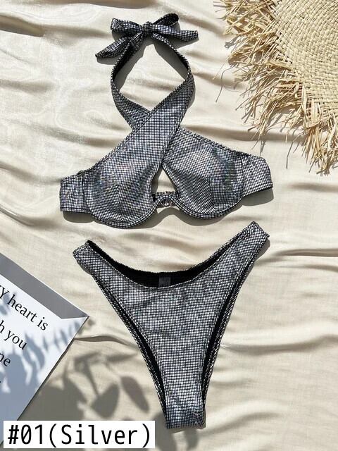 送料無料 セクシーなシルバー光沢のあるビキニ女性 2023 アンダー 2 ピース水着クロスホルター中空アウト水着ウエスト背中の開いた水着 銀 AE33232335542645427575