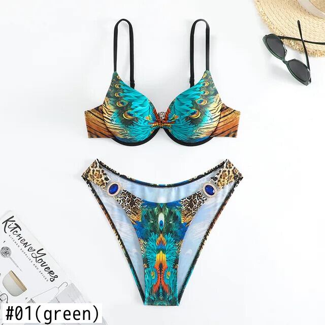 送料無料 グリーンピーコックプリント 2 ピースビキニ女性、2024 夏、ラインストーンローウエスト Tバック水着、アンダーワイヤー V ネック水着 サマー 夏物 Vネック AE33232335590023152180