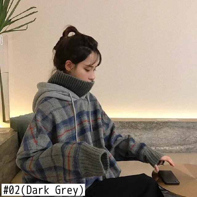 送料無料 フード付きセーター女性のフリースフェイクツーピースステッチチェック柄タートルネックプルオーバーセーター 2024 厚く暖かい長袖フード付き ロング AE33232335573150075546