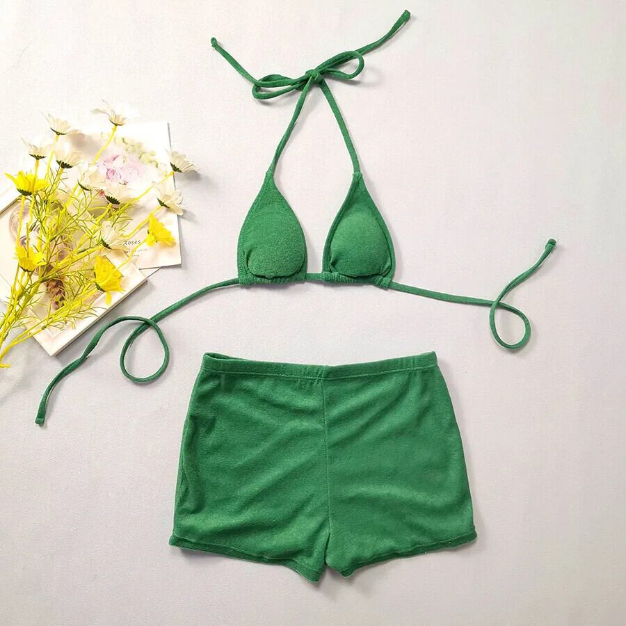 送料無料 2024 グリーンウエストビキニセットタオル地女性の水着夏のビーチ休暇衣装タンキニ水着 サマー 夏物 AE33232335547268664108