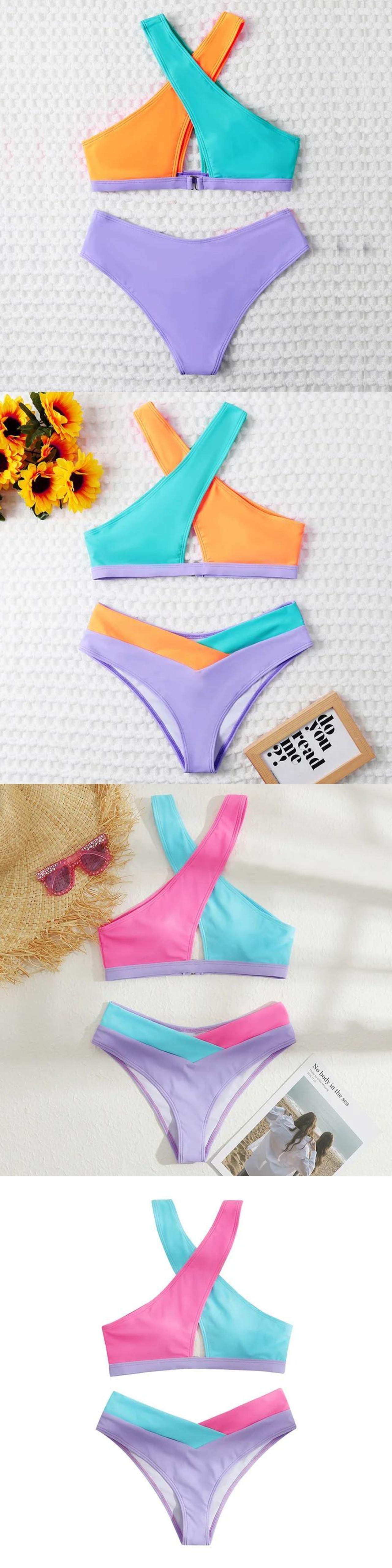 送料無料 セクシーなウエストビキニ 2024 女性ネッククロスパッチワークプッシュアップツーピース水着ビーチ包帯水着マイクロ水着 AE3323233553204542718
