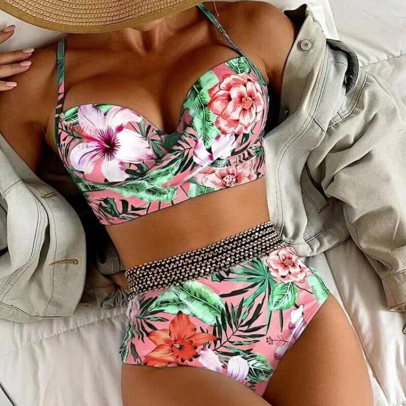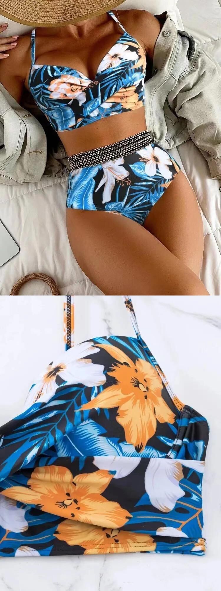送料無料 2024 花柄レディース水着、ウエスト包帯タンキニ、セクシーなアンダーワイヤー V ネックサスペンダー背中の開いた夏水着 サマー 夏物 Vネック AE33232335525635562703