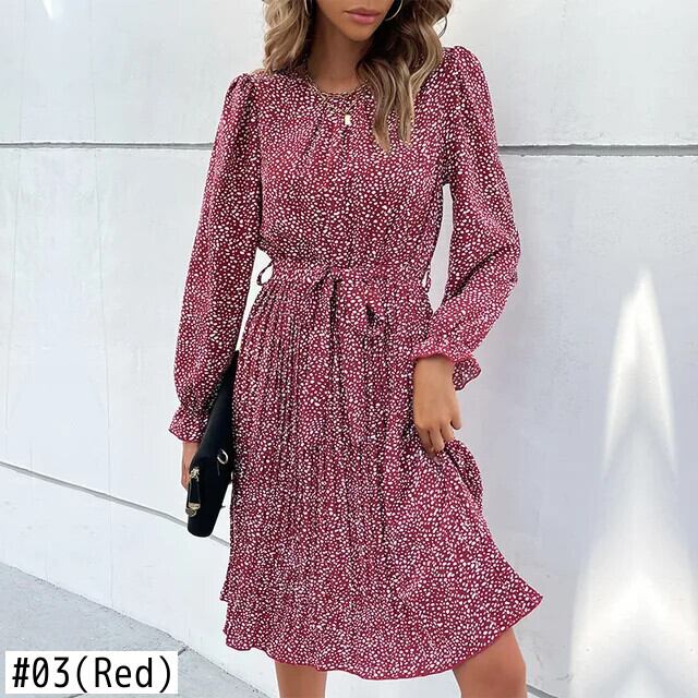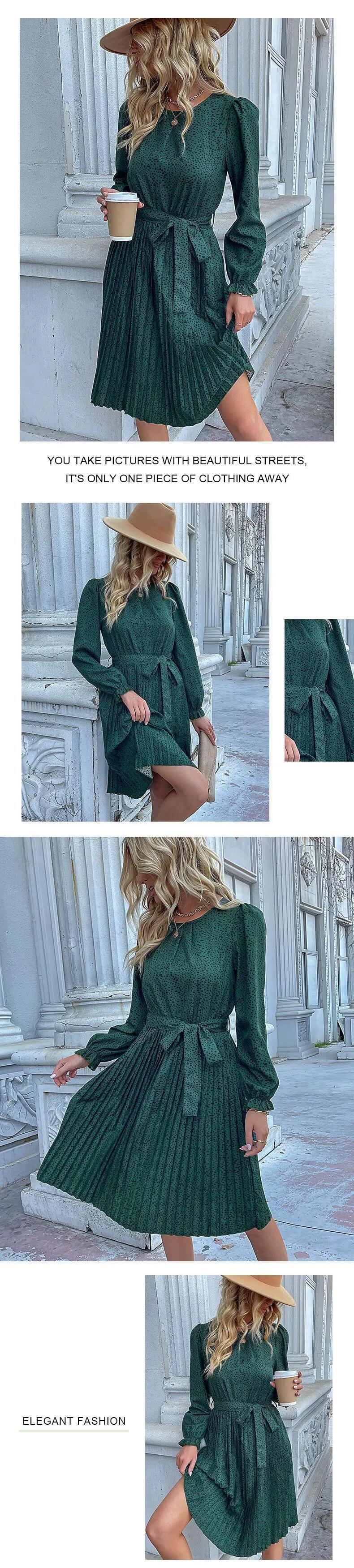 送料無料 ドットプリントドレスレディース2024春と秋の気質長袖ラウンドネックベルト付きレースミッドレングスナイトドレス ロング スプリング 春物 オータム 秋物 ハーネス Oネック AE33232335565744736839