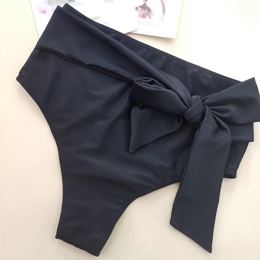送料無料 2024 フリル水着女性、無地黒 2 ピースビキニ、ハイウエスト V ネック背中の開いた水着ビーチ水着 ハイウェスト ブラック Vネック ソリッドカラー AE33232335590752109858