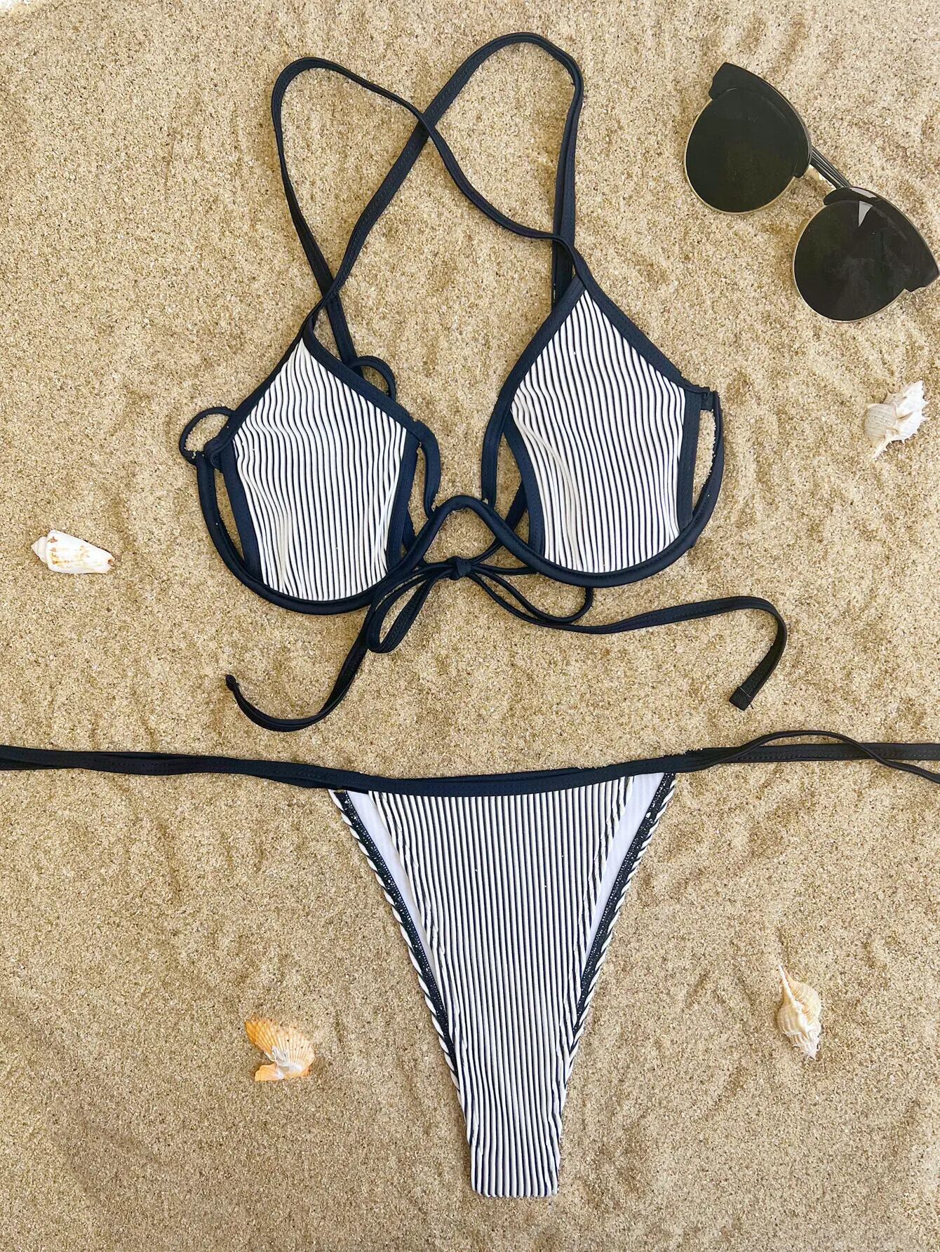 送料無料 ストライプスプライシング水着女性 2023 中空アウト 2 ピースビキニローウエストレースアップ Tバック水着夏の背中の開いたビーチ水着 サマー 夏物 AE3323233558731295460