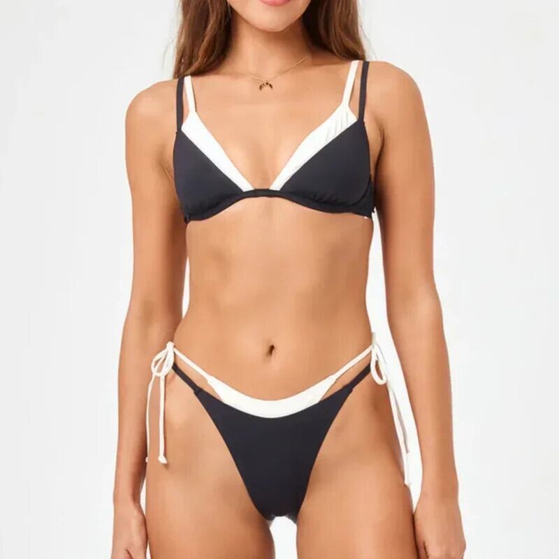 送料無料 ブラックホワイトカラーコントラスト水着女性、2024夏2ピースビキニセット、セクシーなVネックサスペンダーレースアップバックレスビーチ水着 サマー 夏物 AE33232335546314904145