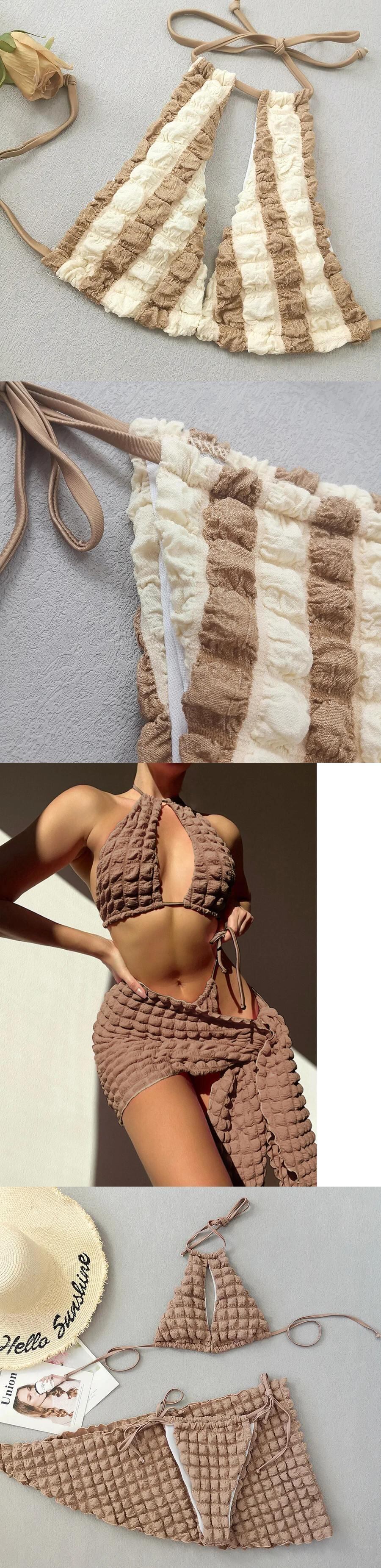送料無料 シアサッカーストライププリント3ピース水着、2024夏中空アウトビキニセット、ローウエストTバックビーチスカート水着 サマー 夏物 AE33232335536152187714