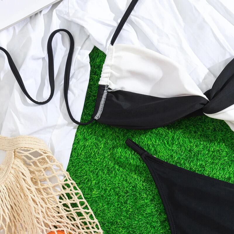 送料無料 ブラックホワイトパッチワークツーピース水着女性、2024夏ローウエストTバックビキニサスペンダー背中の開いたレースアップ水着 サマー 夏物 AE33232335532861859277