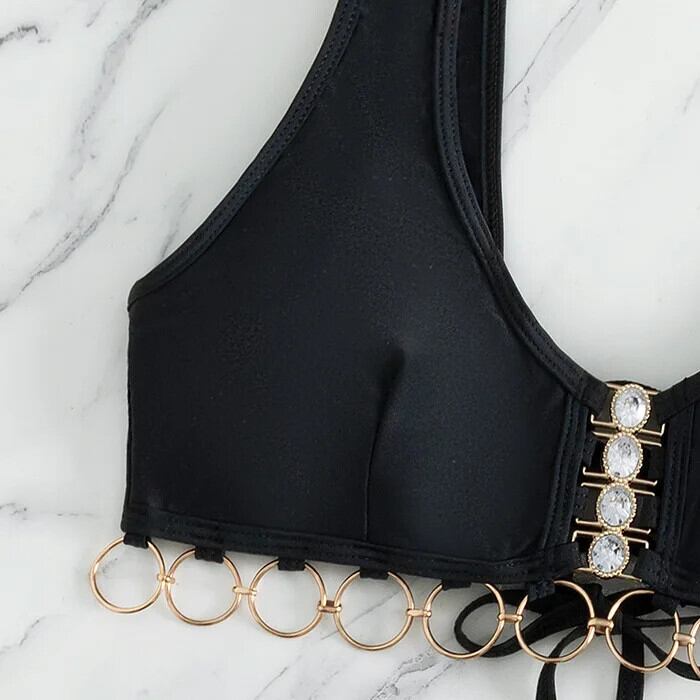 送料無料 セクシーなダイヤモンドビキニセット女性 2023 高級ラインストーンツーピース水着メタルリング水着サスペンダーバックレースアップビーチウェア 指輪 AE33232335582042206461