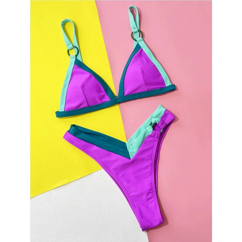送料無料 2024 夏の水着女性パープルパッチワークツーピースビキニ三角カップサスペンダー背中の開いた水着 V ネックビーチ水着 サマー 夏物 Vネック AE33232335598268267877