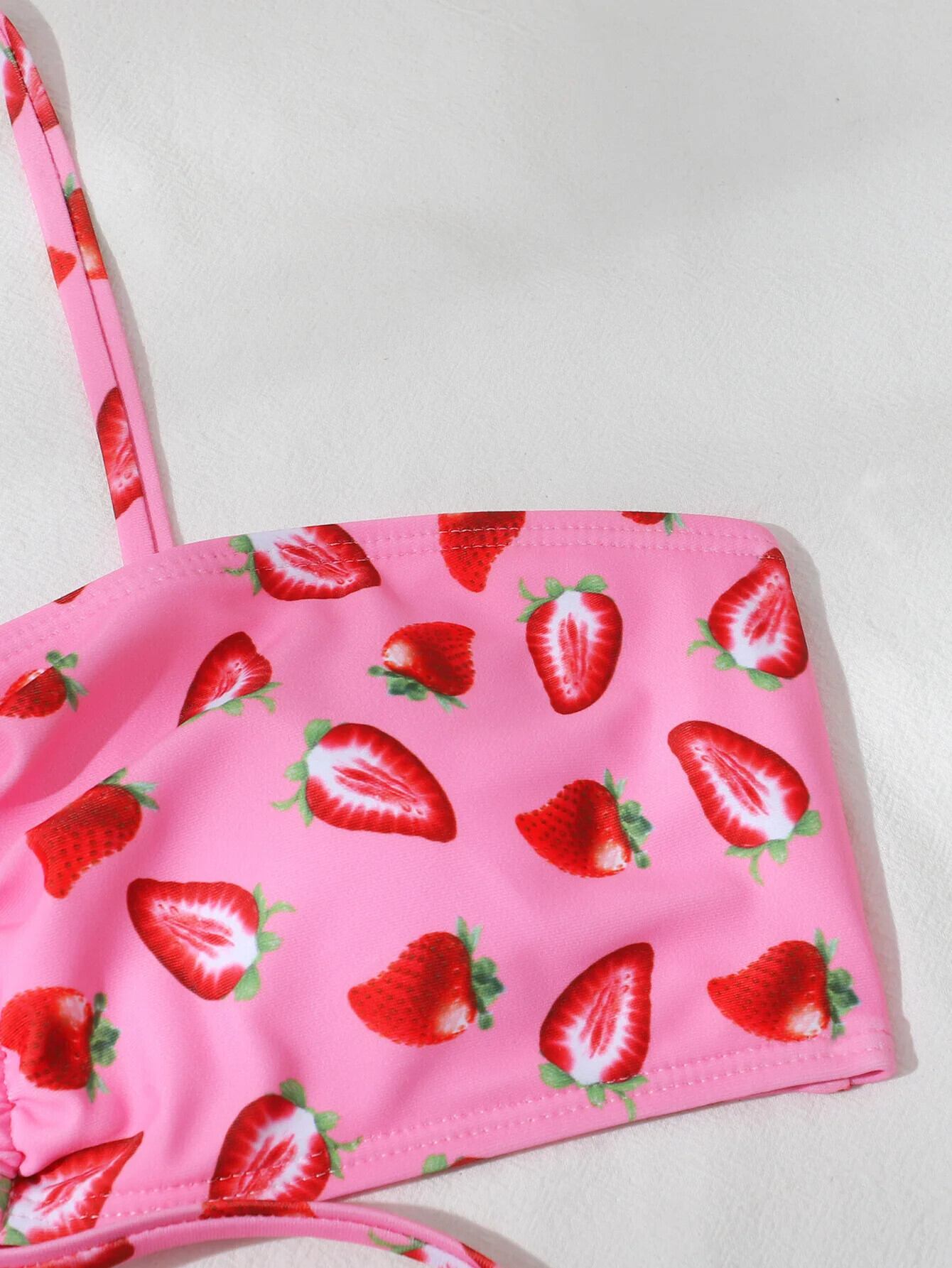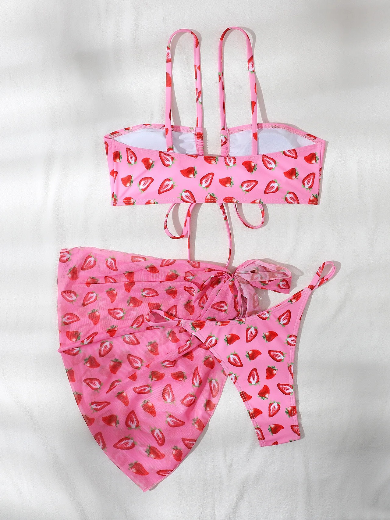 送料無料 イチゴプリントビキニセット 2024 女性水着スリーピース水着バンドゥ巾着ホルター背中の開いたチュールスカート水着 AE33232335571790896940