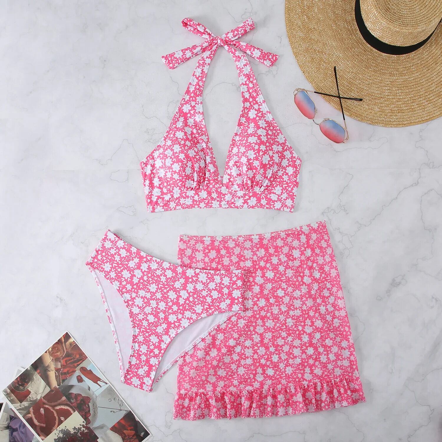 送料無料 2024 ビーチスカートビキニセットフラワープリント 3 ピース水着女性夏休み水着 V ネックサスペンダー水着 サマー 夏物 Vネック フラワーデザイン AE3323233551571097392
