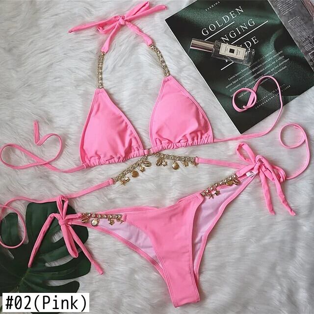 送料無料 2024 クリスタルダイヤモンドビキニクリエイティブアクセサリー水着セクシーなメタルチェーンソリッドカラーの女性ローウエスト Tバックスプリットビーチウェア AE3323233554832882664