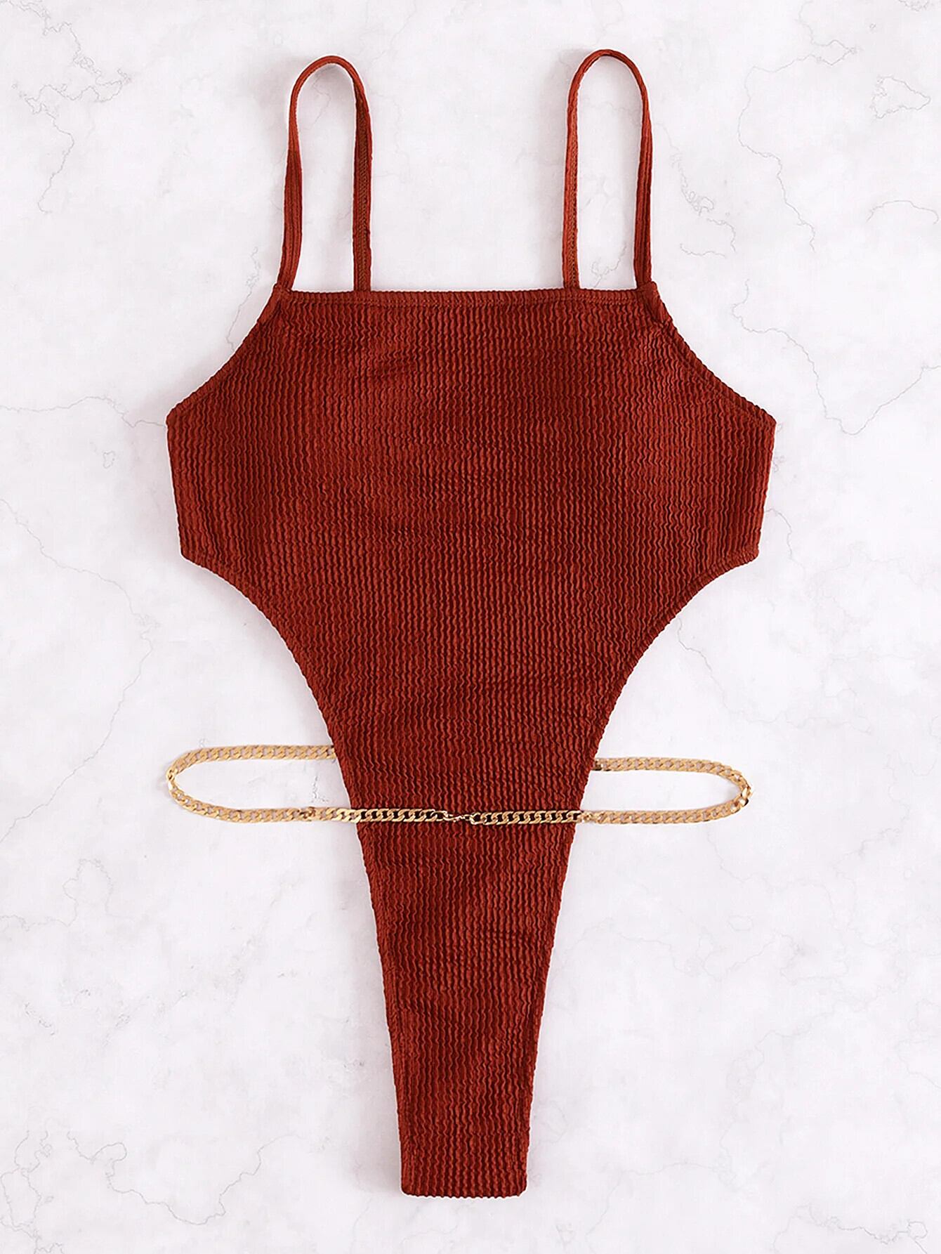 送料無料 セクシーな三角形ワンピース水着女性 2024 ダークブラウン Tバックビキニウエストチェーン水着夏サスペンダー背中の開いたモノキニ サマー 夏物 AE33232335599155368215