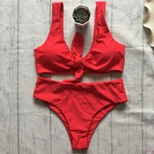 送料無料 2024 レッドウエストビキニ女性、無地フロントネクタイ 2 ピース水着、サスペンダー背中の開いたパダー水着水着 ソリッドカラー AE33232335522972339655