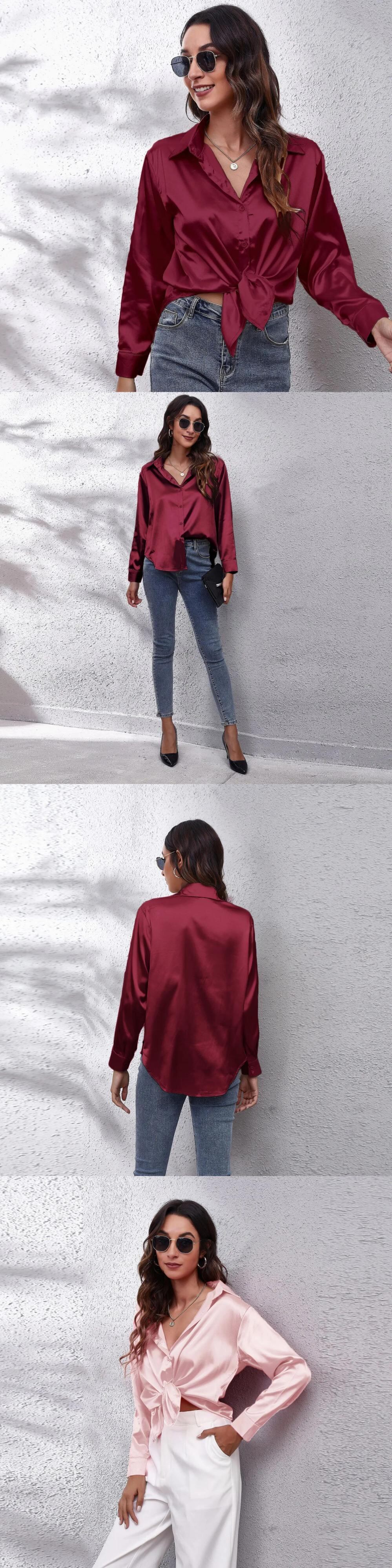 送料無料 ソリッドカラースウェットシャツ女性、2023秋冬、サテンイミテーションシルク長袖シャツ、シングルブレスト、ラペルカラーカーディガン ロング オータム 秋物 ウィンター 冬物 AE3323233555154233356