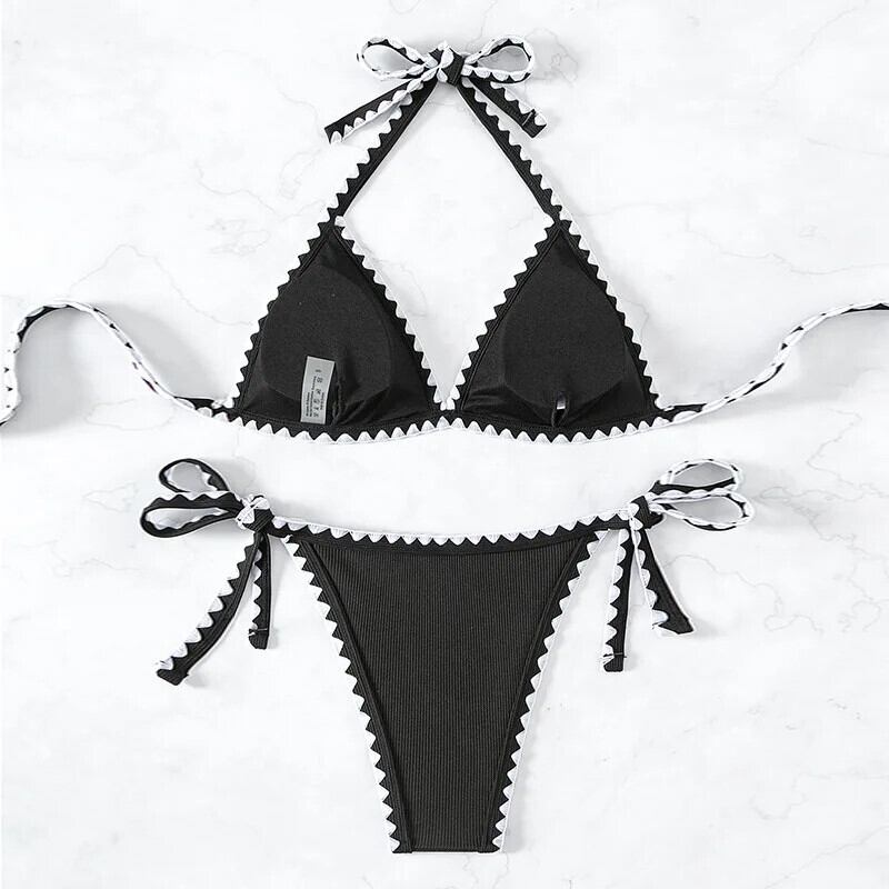送料無料 2024 2 ピース水着女性、ブラックホワイトカラーコントラストビキニセット、ジグザグプリント水着、V ネックサスペンダービーチウェア Vネック AE33232335540802117923