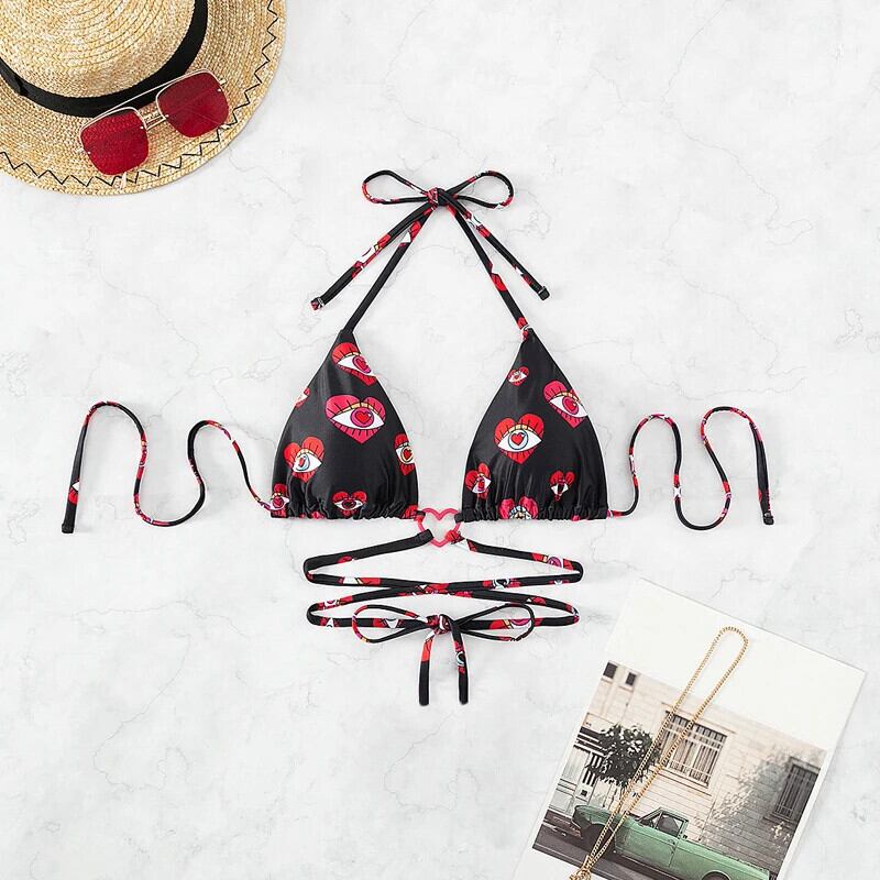 送料無料 Love Eyes プリントビキニ、2 ピース水着女性、クロスストラップ水着、ローウエスト Tバック、サスペンダーレースアップバックレス水着 AE33232335554637074545