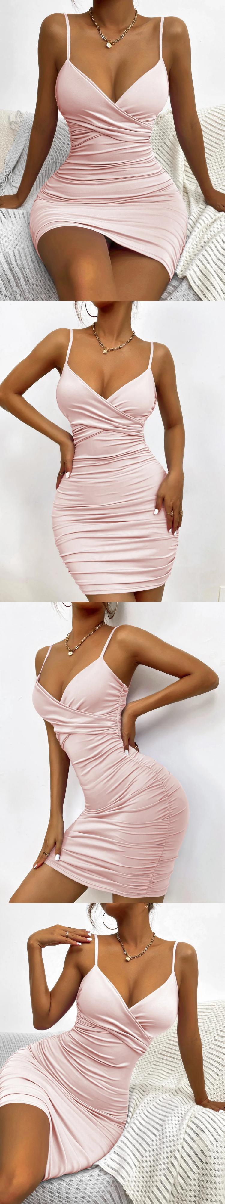 送料無料 2023 夏のセクシーな V ネックサスペンダー背中の開いたドレス女性ソリッドカラーホワイトウエストプリーツスリムヒップラップミニドレス サマー 夏物 Vネック AE33232335535608858410