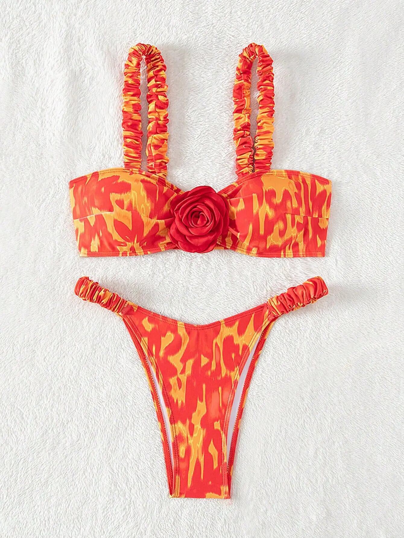 送料無料 2024 タイダイプリント女性用水着、3D フラワーオレンジレッド 2 ピースビキニセット、セクシーなリンクルサスペンダー背中の開いた Tバック水着 フラワーデザイン AE33232335581863456937