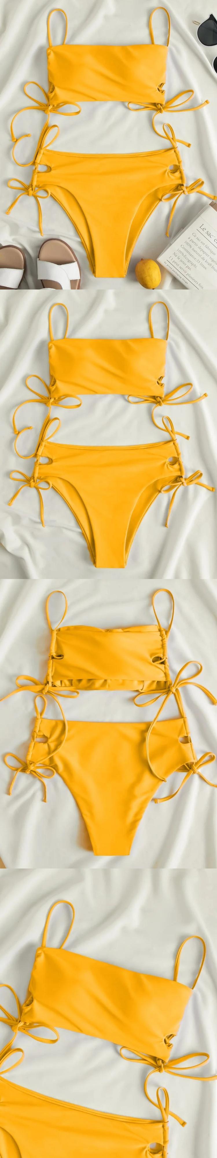送料無料 ソリッドカラー 2 ピースウエスト水着女性 2023 セクシーなバンドゥサスペンダー背中の開いたビキニ巾着レースアップビーチ水着 AE3323233557479172822