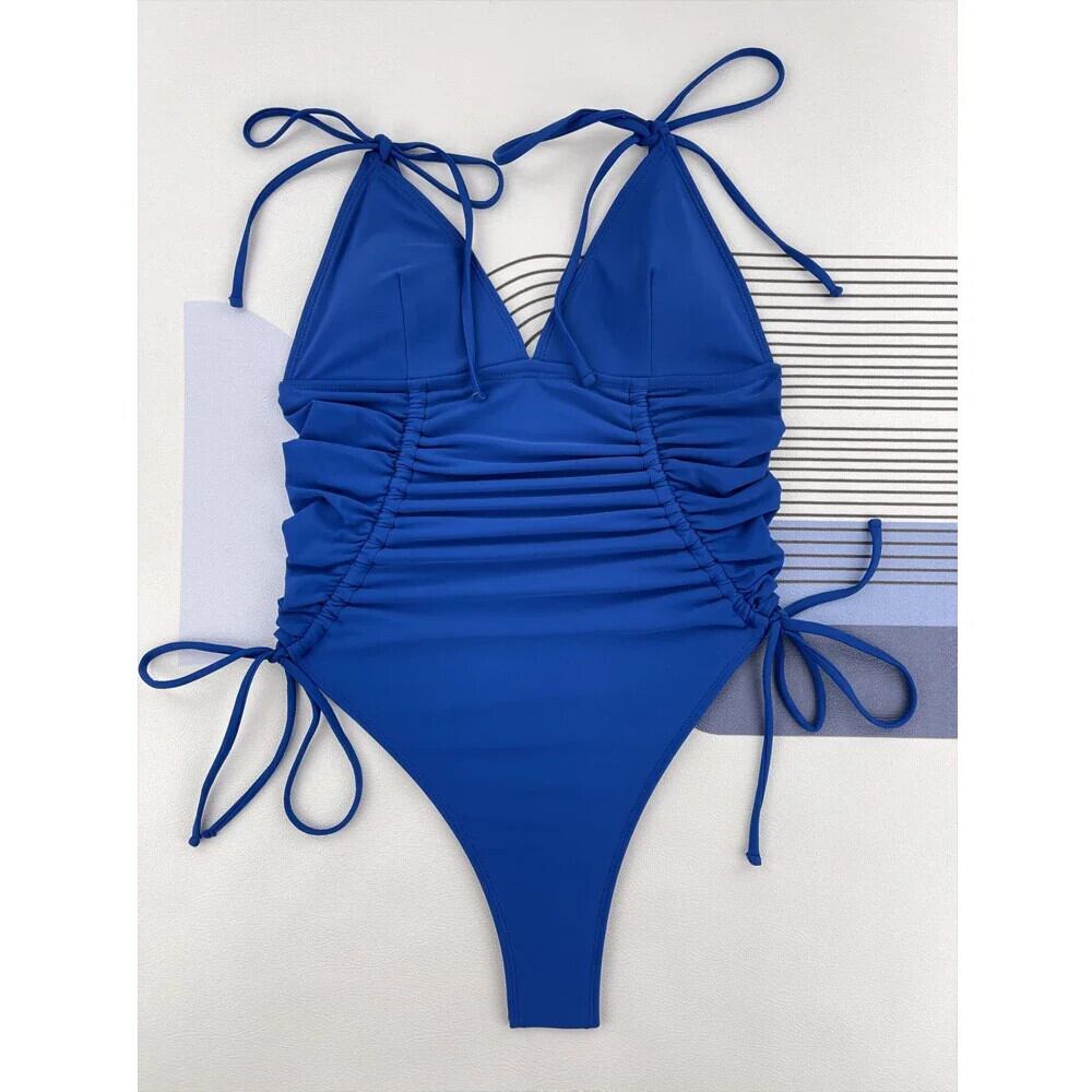 送料無料 2024 ワンピース水着女性ブルー巾着プリーツビキニセクシーな V ネックサスペンダーレースアップ背中の開いたモノキニ夏のビーチウェア サマー 夏物 Vネック AE33232335532077003603