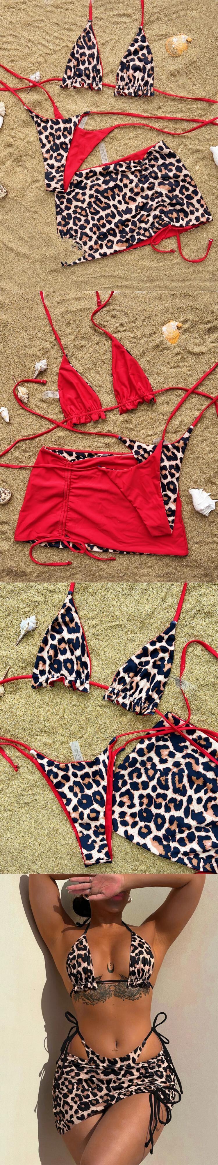 送料無料 セクシーなヒョウ 3 ピース水着女性 2023 可逆ビキニセクシーなローウエストビーチスカート Tバック水着背中の開いた水着 AE3323233556571463144