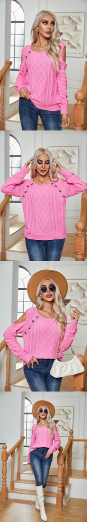 送料無料 ソリッドカラー長袖ニットプルオーバーセーター女性、2023秋冬、ファッションスクエアネックオフショルダーボタンセーター ロング オータム 秋物 ウィンター 冬物 スクウェア AE33232335589211548373