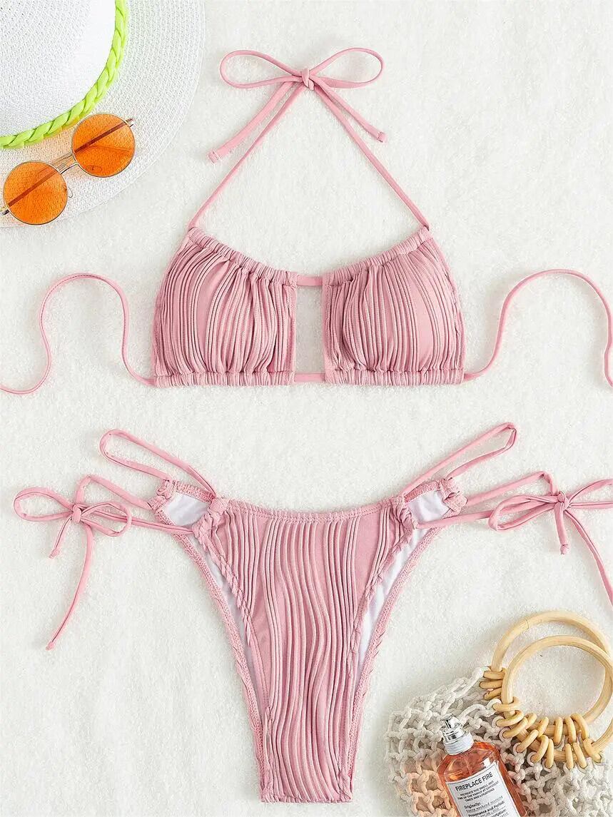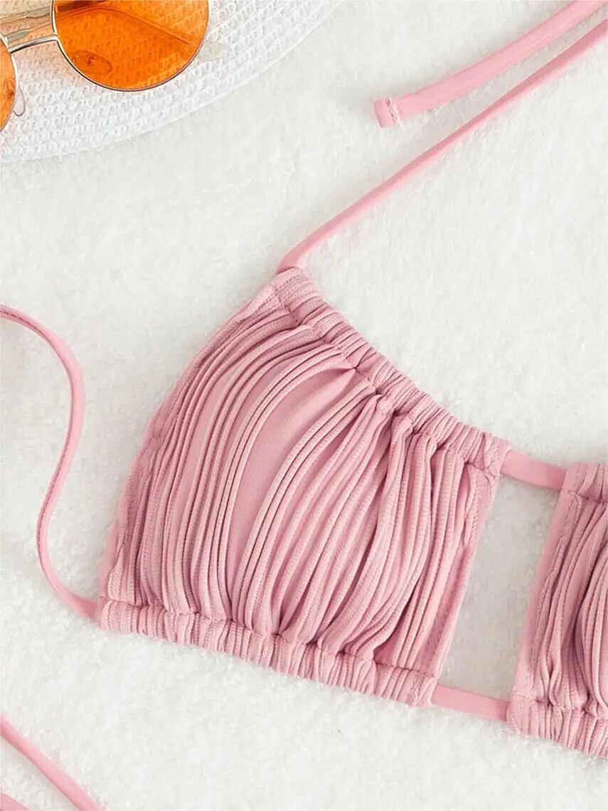 送料無料 ソリッドカラープリーツ水着女性 2023 ピンクツーピースウエストビキニセクシーな中空アウトサスペンダー水着水着 HXA152 AE33232335581285352511